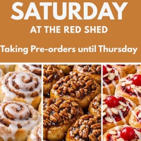 Preorders taken until Thursday to secure your special box. There will be limited stock supplies per flavour at the store on Satruday. Cinnamon buns will be delivered to The Red Shed on Saturday morning at 10am