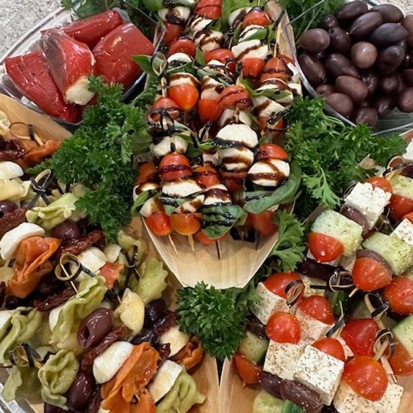 Greek feta skewers, Caprese skewers, Pesto tortellini skewers served with antipasta and gourmet antipasto.